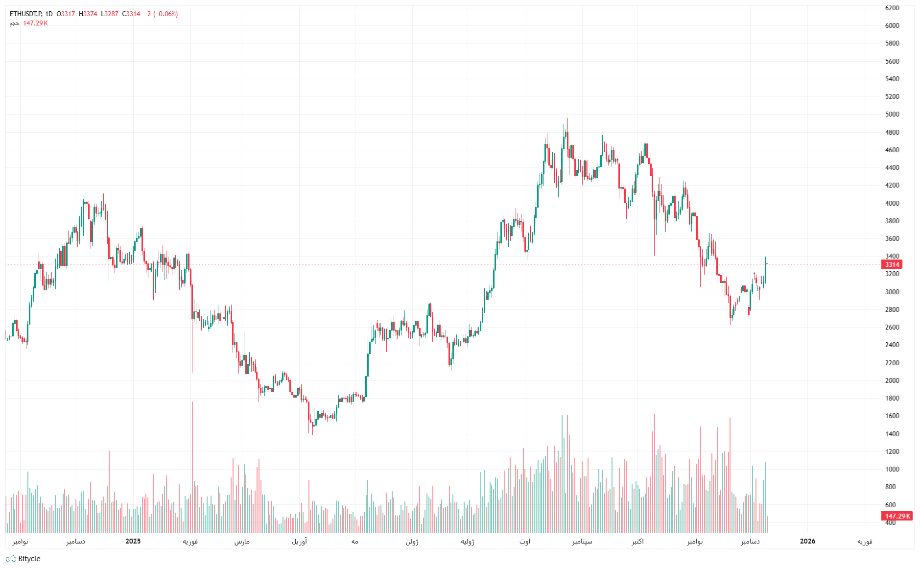 قیمت فعلی: قیمت اتریوم حدود ۳۱۰۰ دلار؛ تلاش برای عبور از مقاومت ۳۸۵۰–۳۹۰۰ دلار.