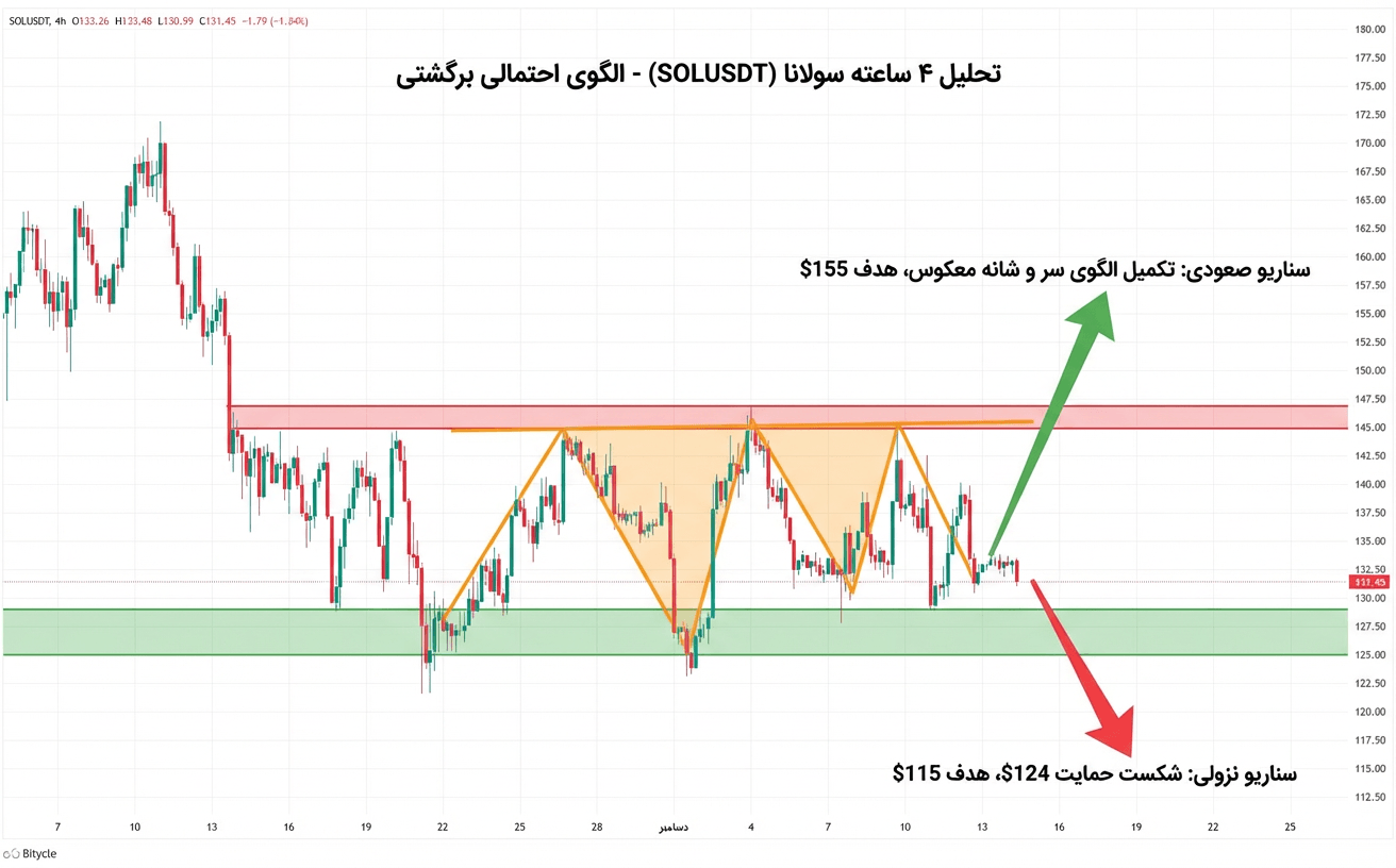 - سناریوی صعودی: در صورت شکست معتبر خط گردن (حدود ۱۴۲ دلار)، انتظار رشد قیمت سولانا تا هدف ۱۵۵ دلار وجود دارد.
