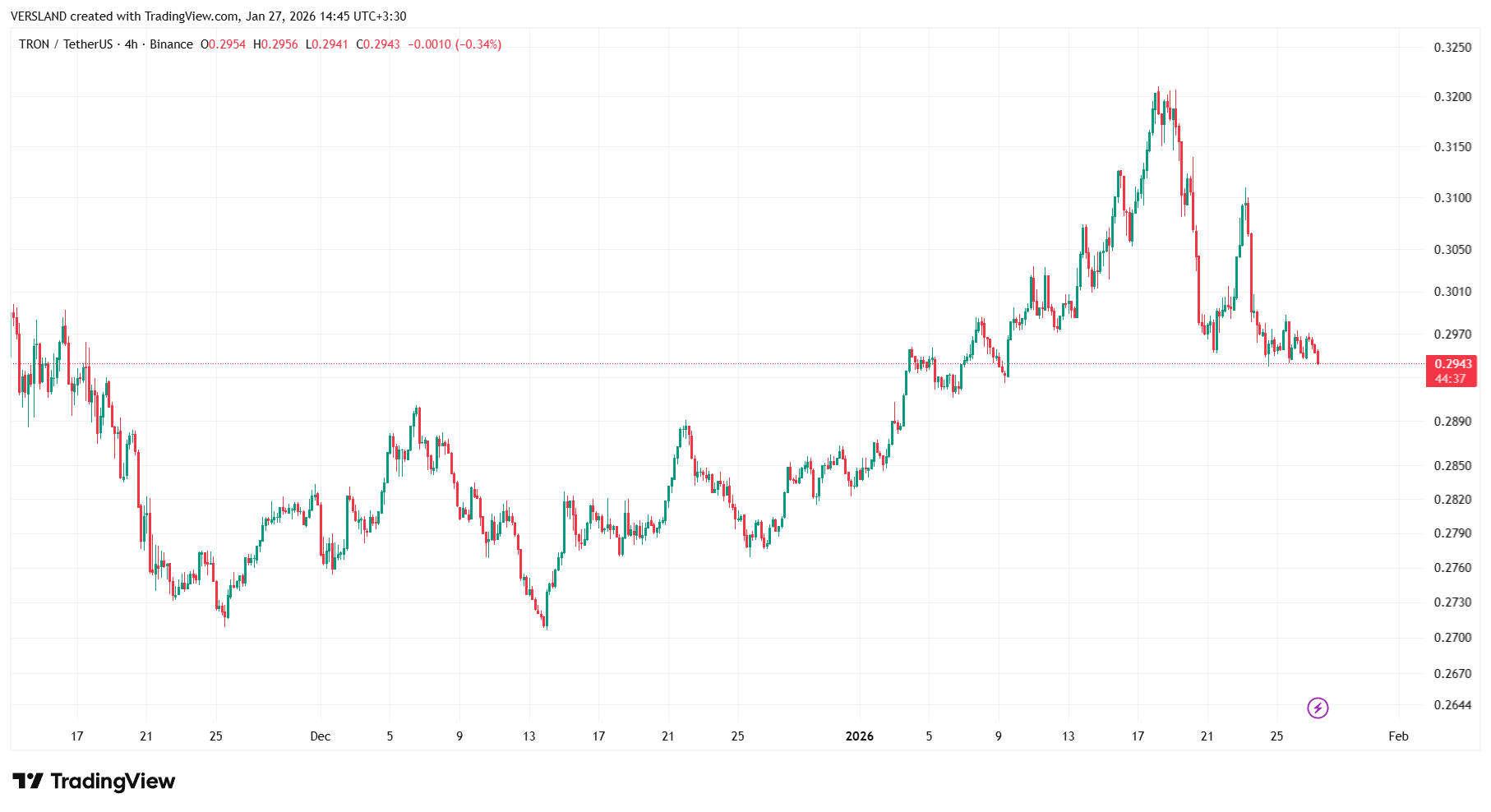 الان قیمت ترون حوالی 0.294 دلار در حال نوسان است؛ یعنی دقیقاً روی یک ناحیه مهم تصمیمگیری.