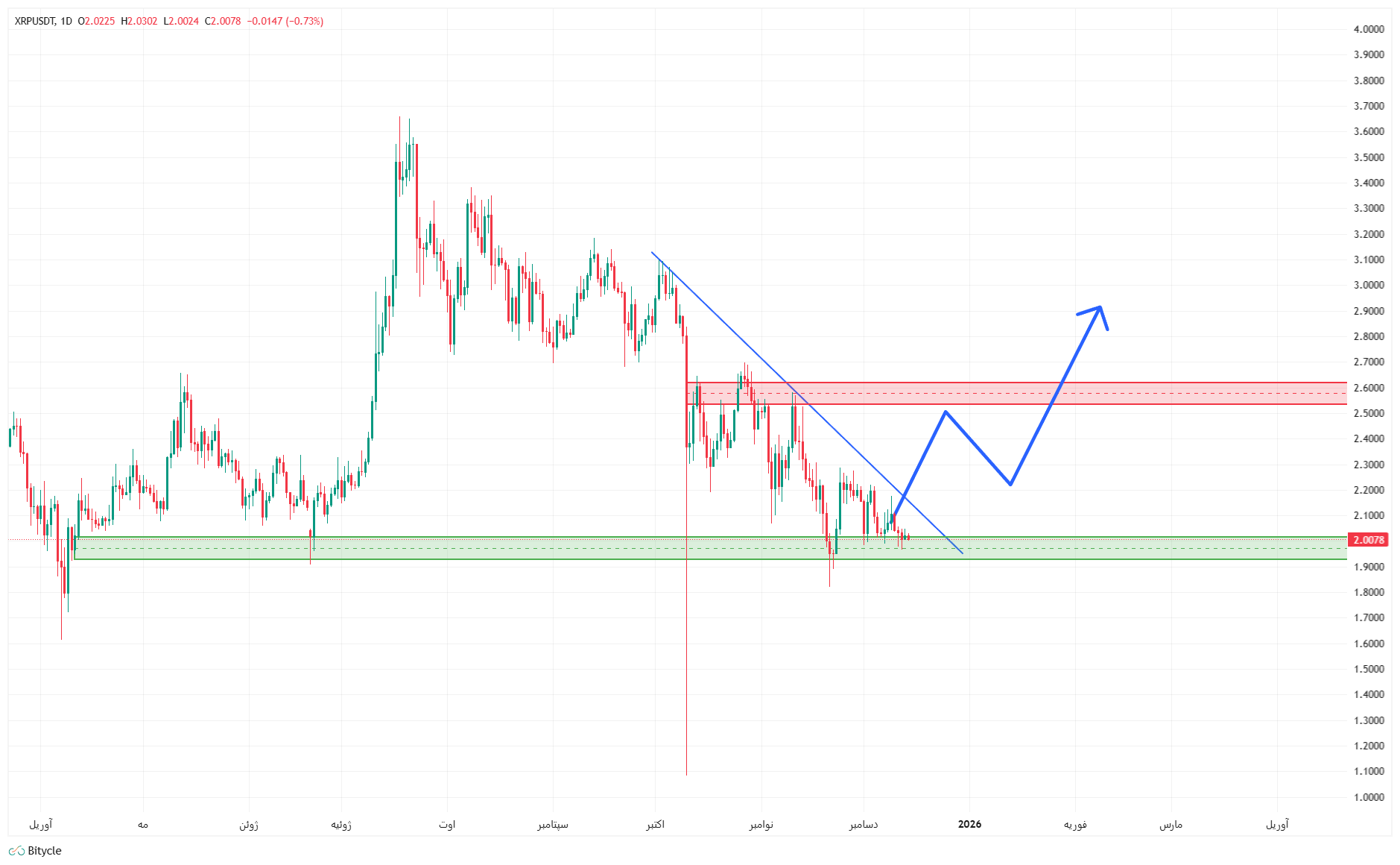 قیمت ریپل الان دقیقاً روی یک تشک حمایتی محکم در محدوده ۲.۰۰ دلار (باکس سبز) نشسته است. همزمان، یک خط روند نزولی (خط آبی کج) مثل سقف روی سر قیمت سنگینی می‌کند. نمودار می‌گوید که قیمت در انتهای کنج گیر افتاده و وقت تصمیم‌گیری است.